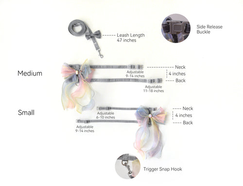 Blue, purple and all your favorite colors blended into one mesh butterfly bow. Dazzled with gem and shinny laces, this harness is the perfect choice for a glamorous casual stroll with your furry friend. We also include a gingham plaid leash to go with the harness for a complete fabulous look.